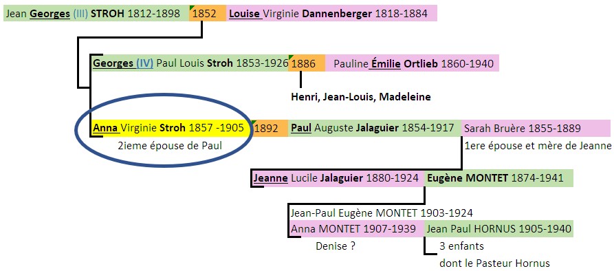 Madeleine Horst avait fait le commentaire généalogique suivant (un différent au niveau des prénoms de la recherche sur Geneanet illustrée au-dessus): « Anna a épousé Paul Jalaguier, veuf avec une fillette Jeanne – élevée par Anna- qui plus tard a épousé Eugene Montet (Secrétaire du Musée Social). Leurs enfants, Jean et Denise sont morts jeunes, peu après la guerre 14-18 et Denise après son mariage avec Hornus dont elle avait eu 3 enfants restés orphelins en bas-age. L’un de ces enfants est devenu le Pasteur Hornus (recherche Scientifique) ».