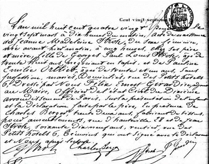 « Nous habitions 6 rue des petits hôtels ou nous avait accueillis , au 4ieme étage de sa maison, la « Grand’ Tante » Trousselle. Mes parents – Georges IV et Émilie- occupaient le grand appartement du palier, tandis que Grand-père (Georges III) et Tante Anna prenaient le petit; mais après le mariage d’Anna avec Paul Jalaguier en 1894, Grand-père est venu nous rejoindre. »